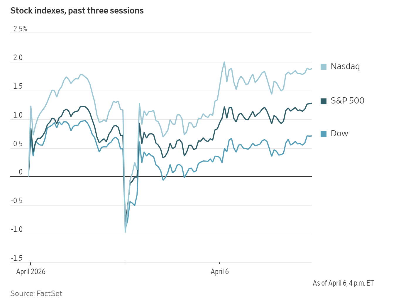 The Dow Jones Industrial Average rose +0.36%, or 165.21 points, on Monday. The Nasdaq Composite was +0.54%, and the S&P 500 advanced +0.44%, with both indices recording their strongest four-day performance since last May.